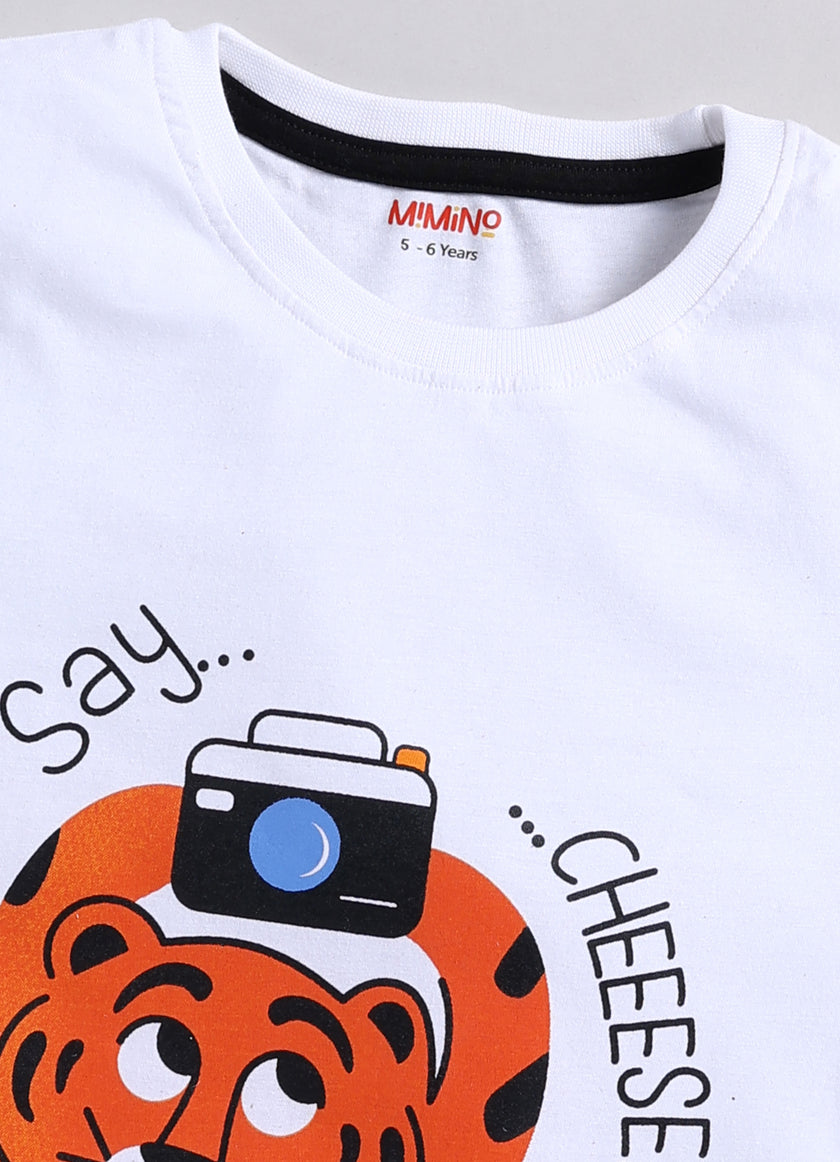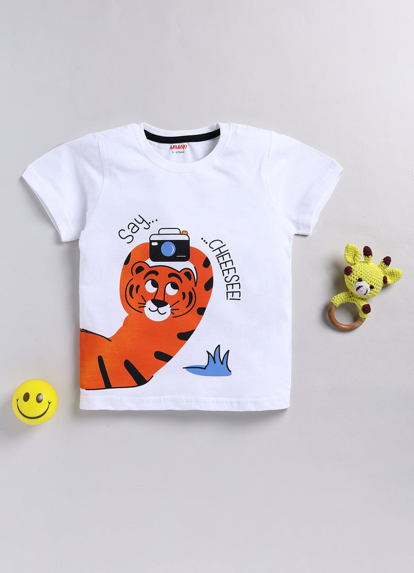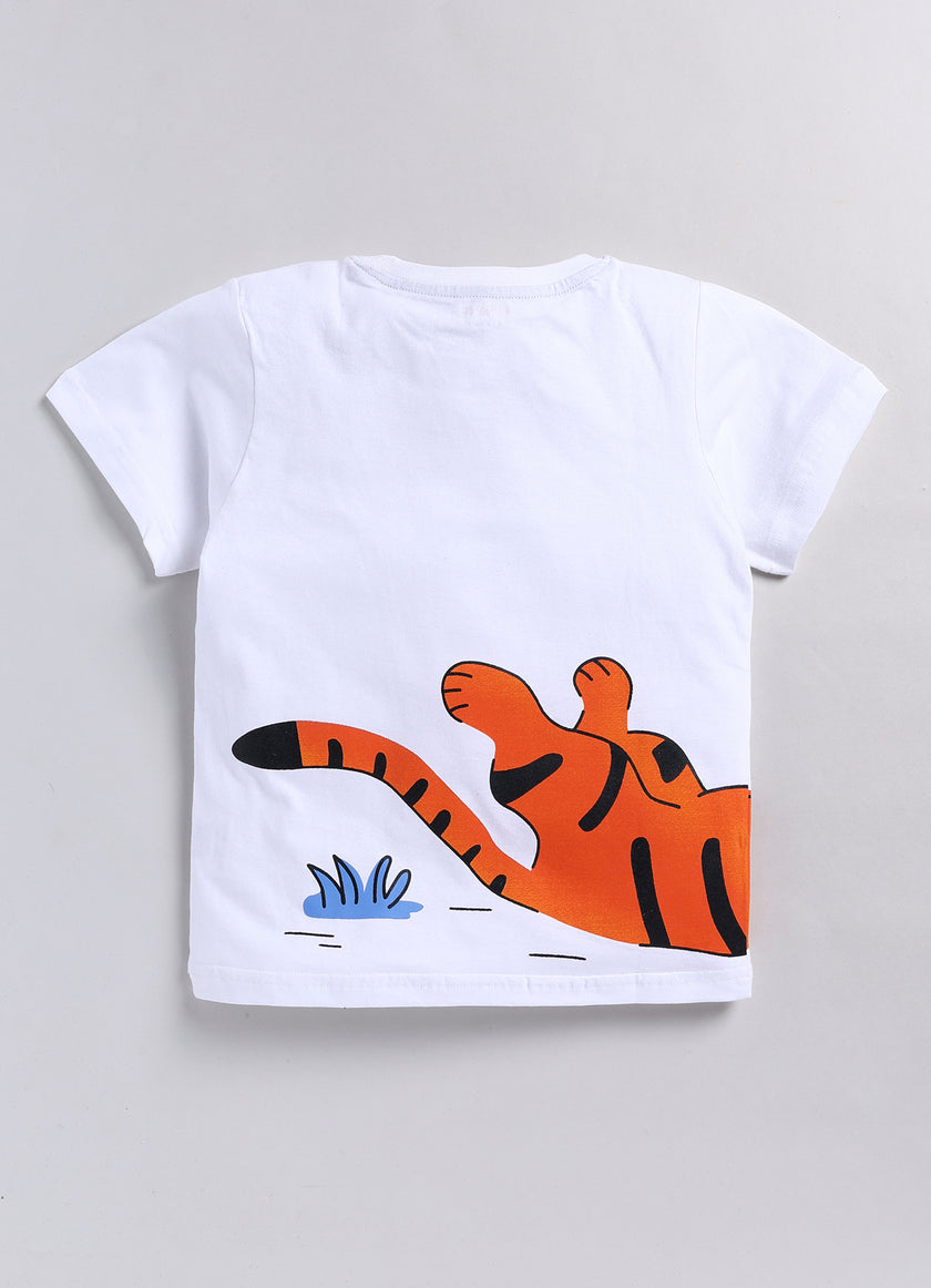 Boys Cotton Made Half Sleeve Tiger Printed White Round Neck T-Shirt
