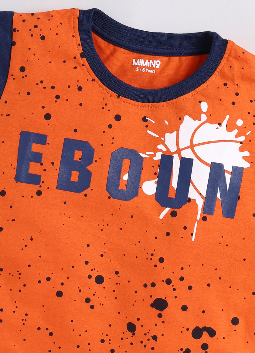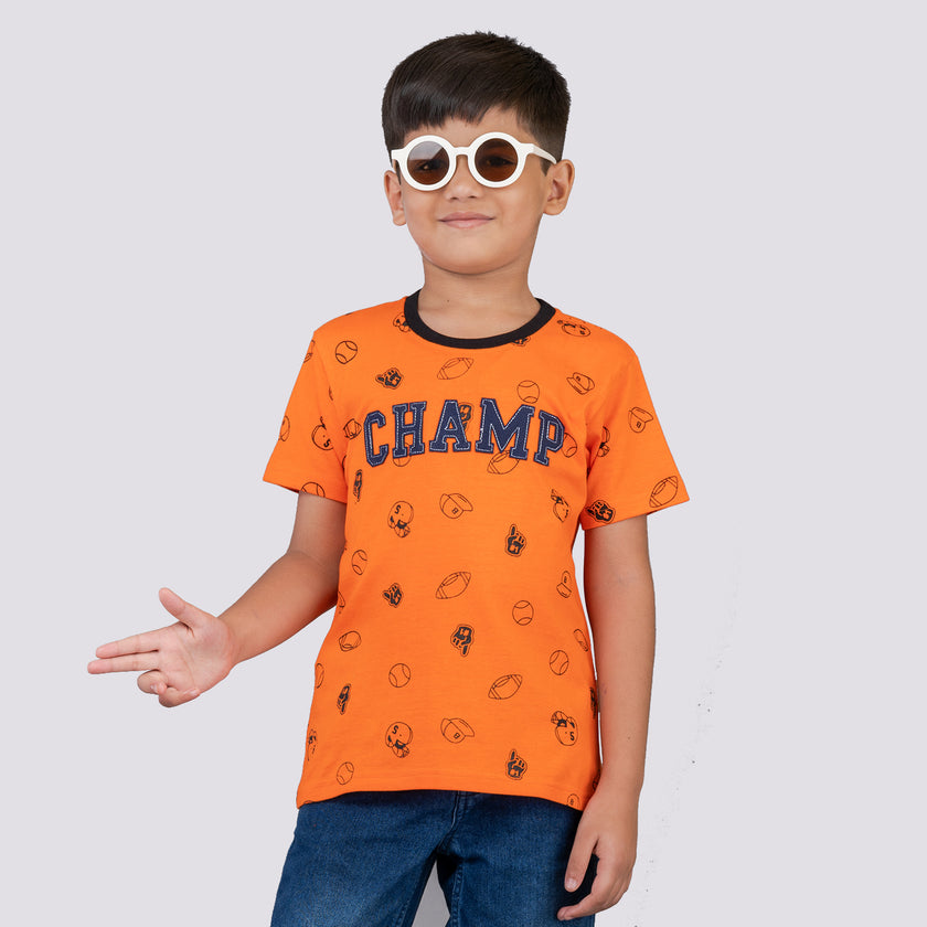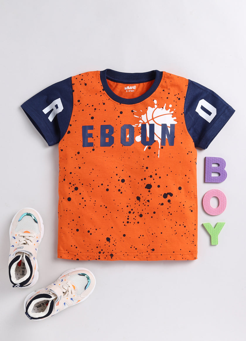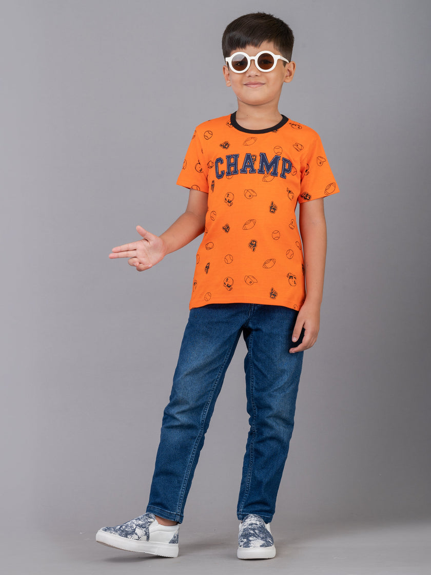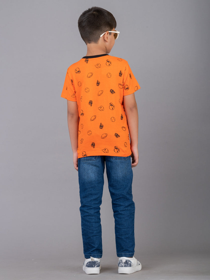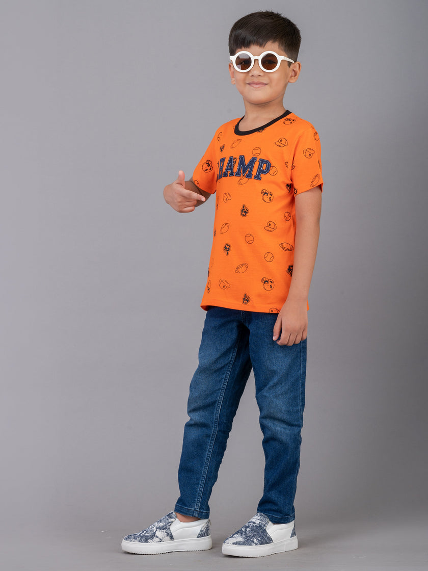 Boys Cotton Made Half Sleeve Printed Orange Round Neck T-Shirt